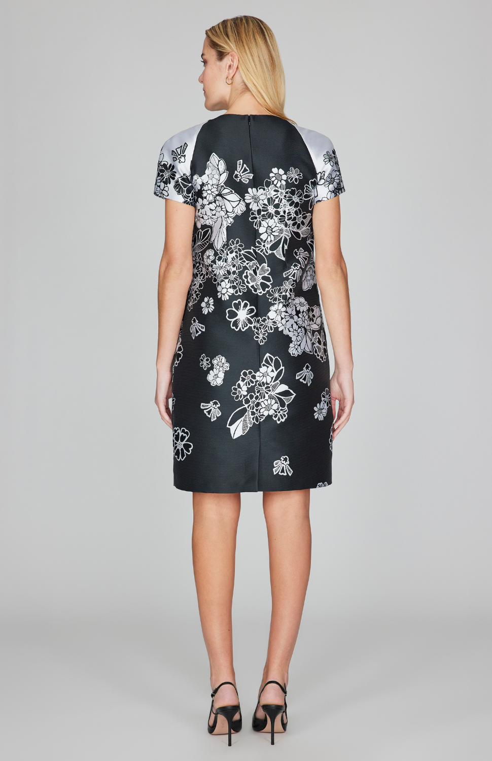 Graphic Flora Jacquard Sheath Dress w/ Contrast Cap Sleeve