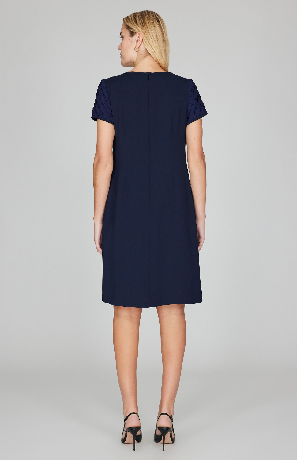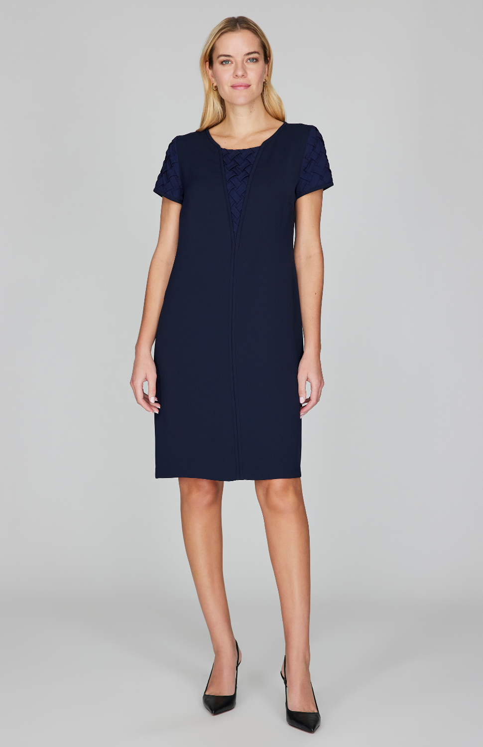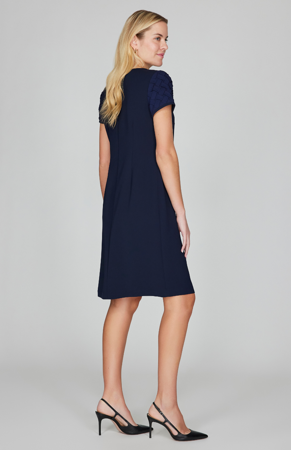 A classic sheath dress cut in our signature Lustrous Crepe. This dress is detailed with textured Lattice Smocking at the short sleeves and the V inset. This dress is unlined and is finished with a back zipper.