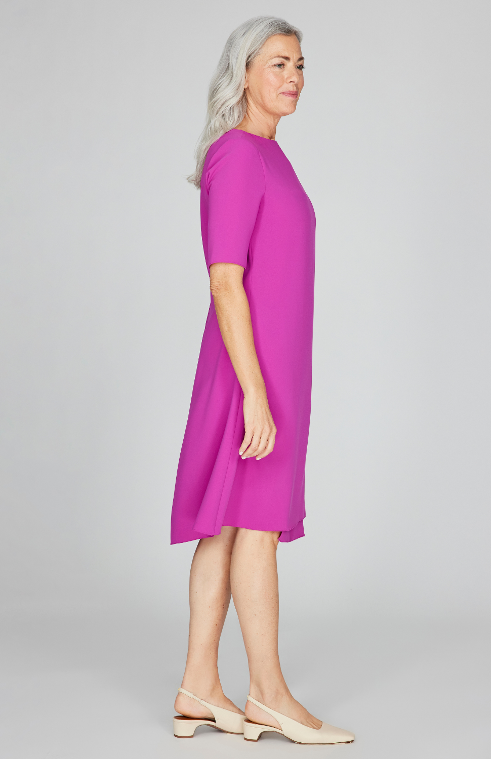 Our classic faux wrap style dress in a new shorter length and with a simple elbow length sleeve for everyday wear. Features and easy fit with a simple back zip and a fluid asymmetric hemline. A great dress to throw in a suitcase for your next trip.