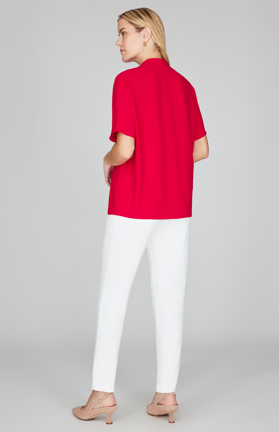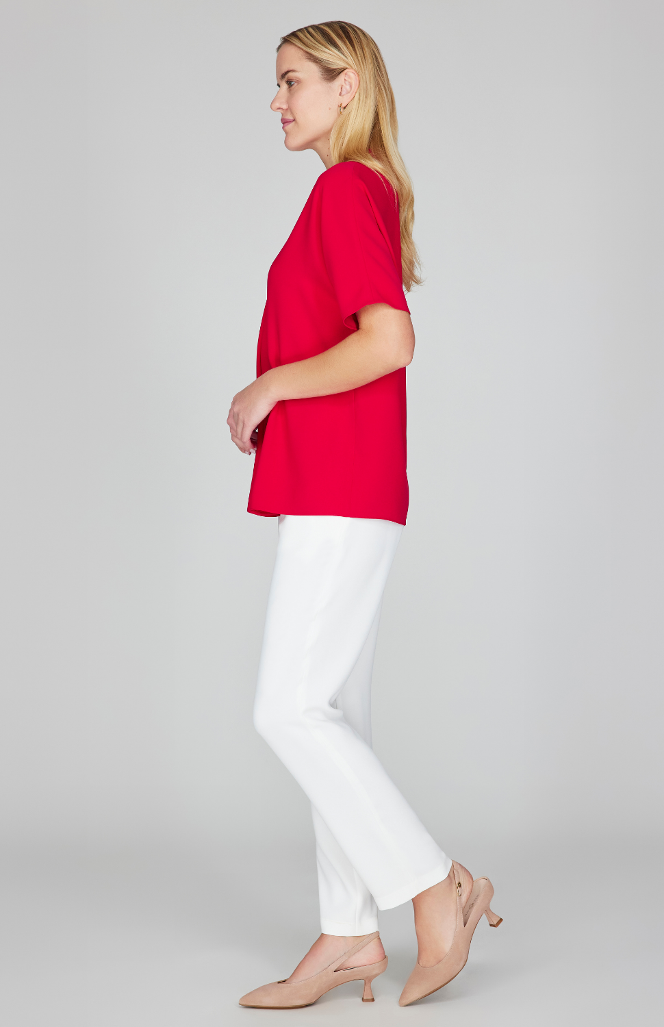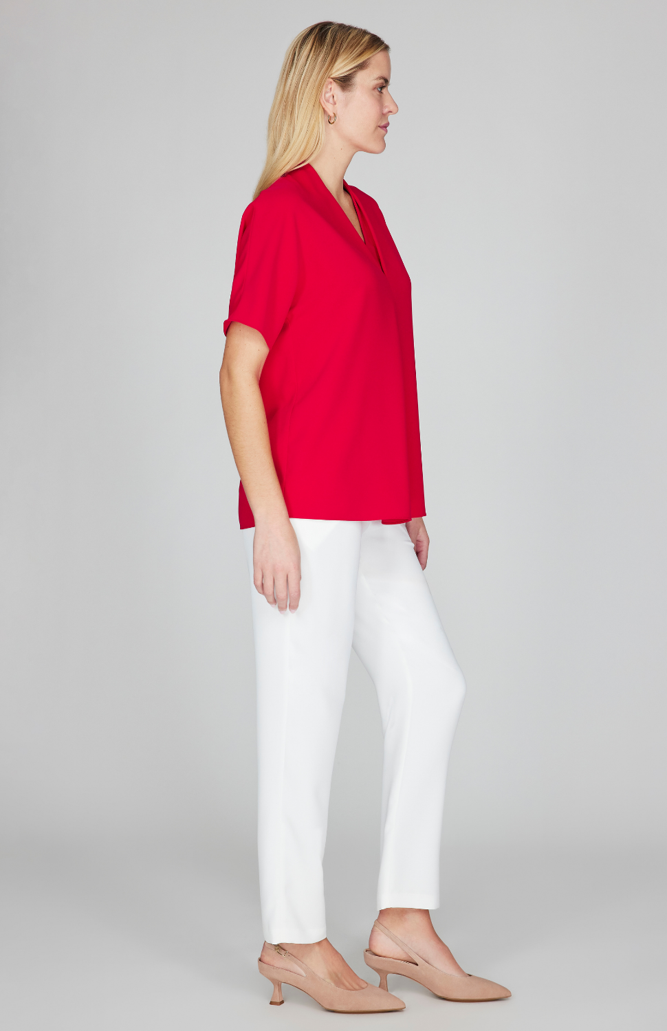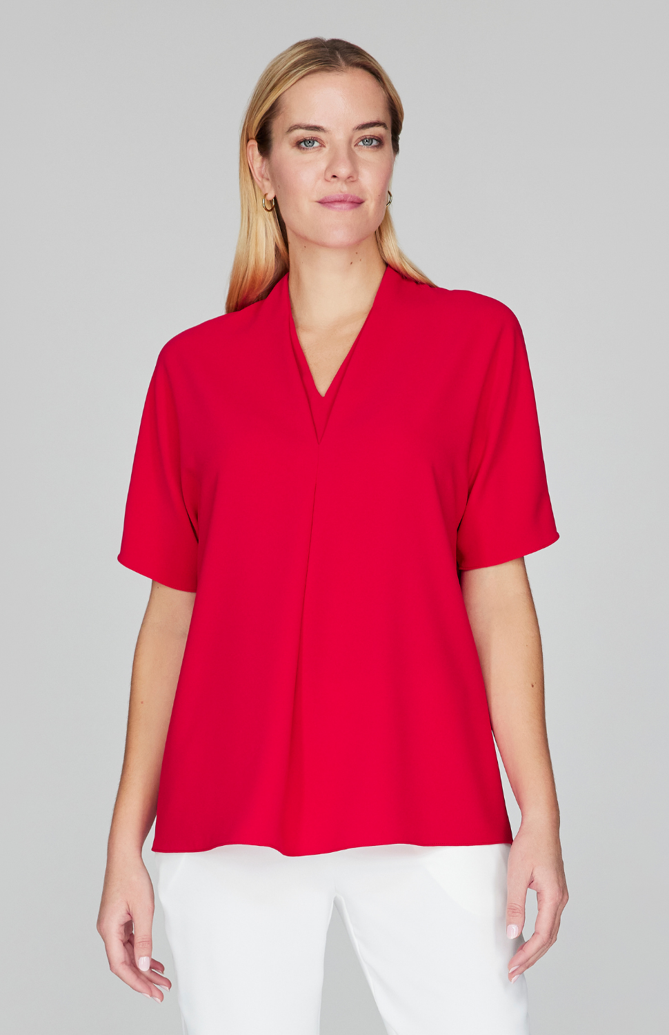A pullover style blouse blouse with dolman sleeves. This top has a flattering V neck with a pleated inset. The inverted pleat below the V offers a soft, slightly floaty silhouette.