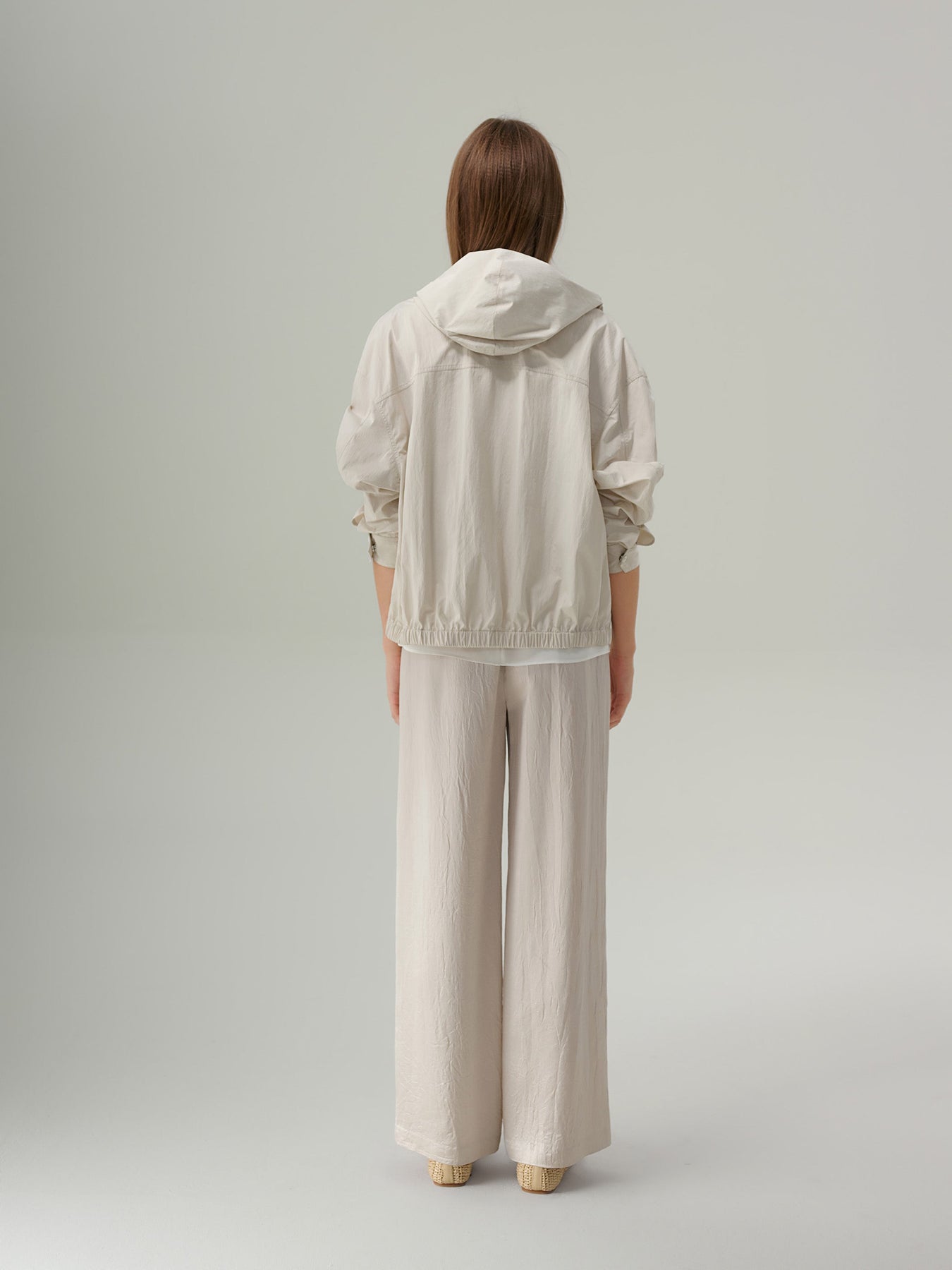Crafted from a lightweight polyester-nylon poplin blend, this fabric delivers a smooth, breathable hand with excellent wrinkle resistance and a subtle sheen. Naturally water-repellent and quick-drying, it offers lasting wear and easy performance—ideal for transitional weather and everyday versatility.