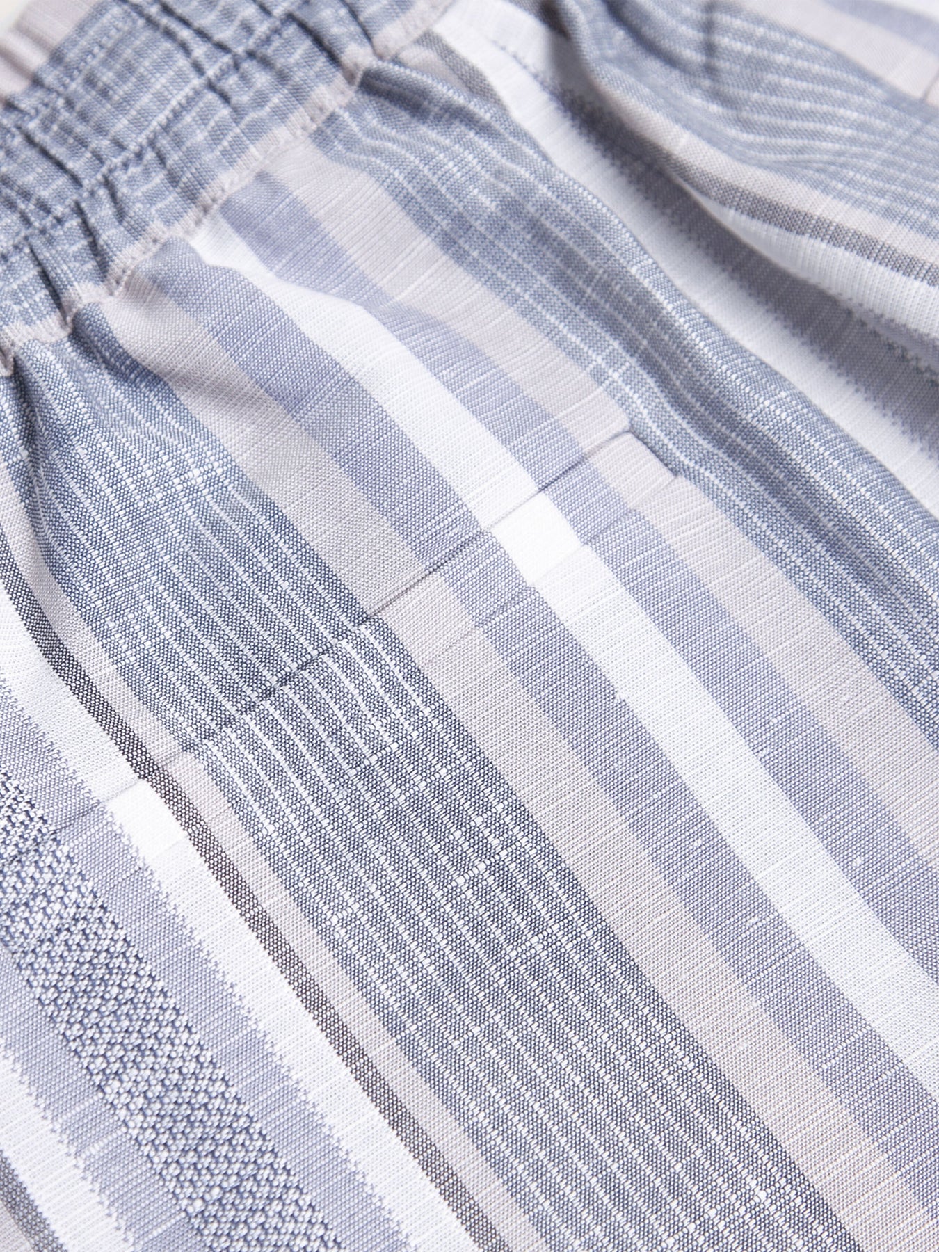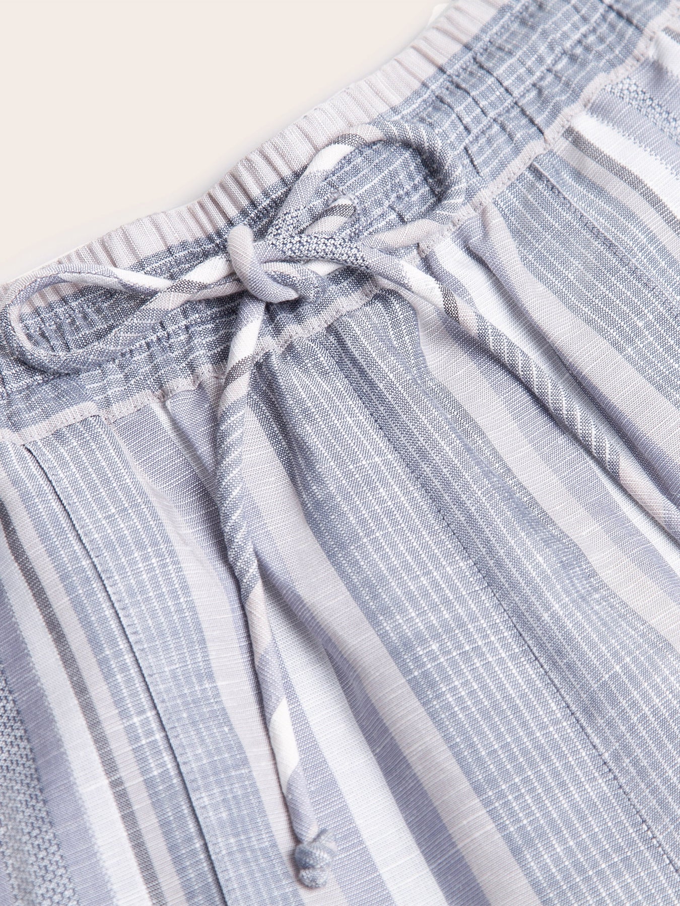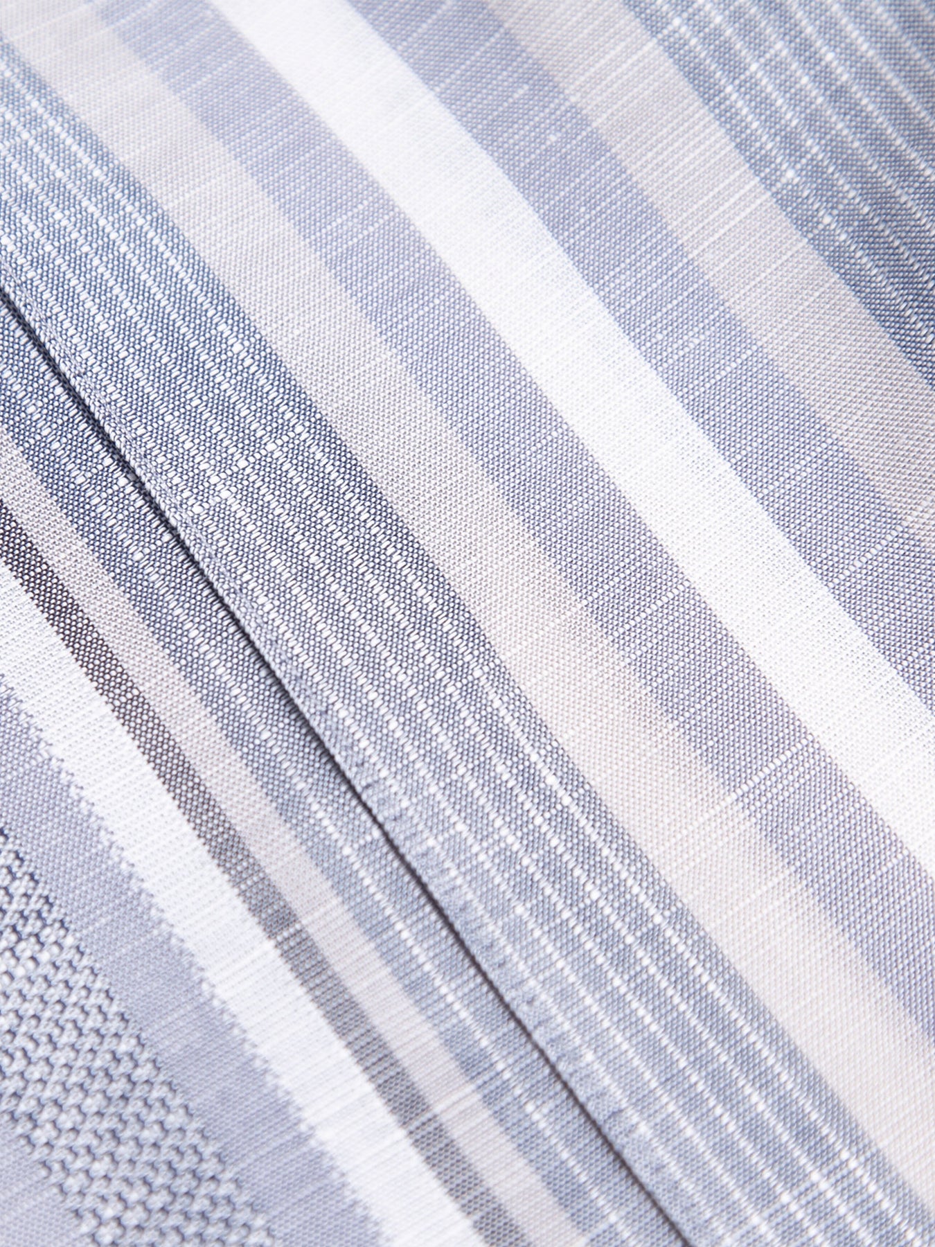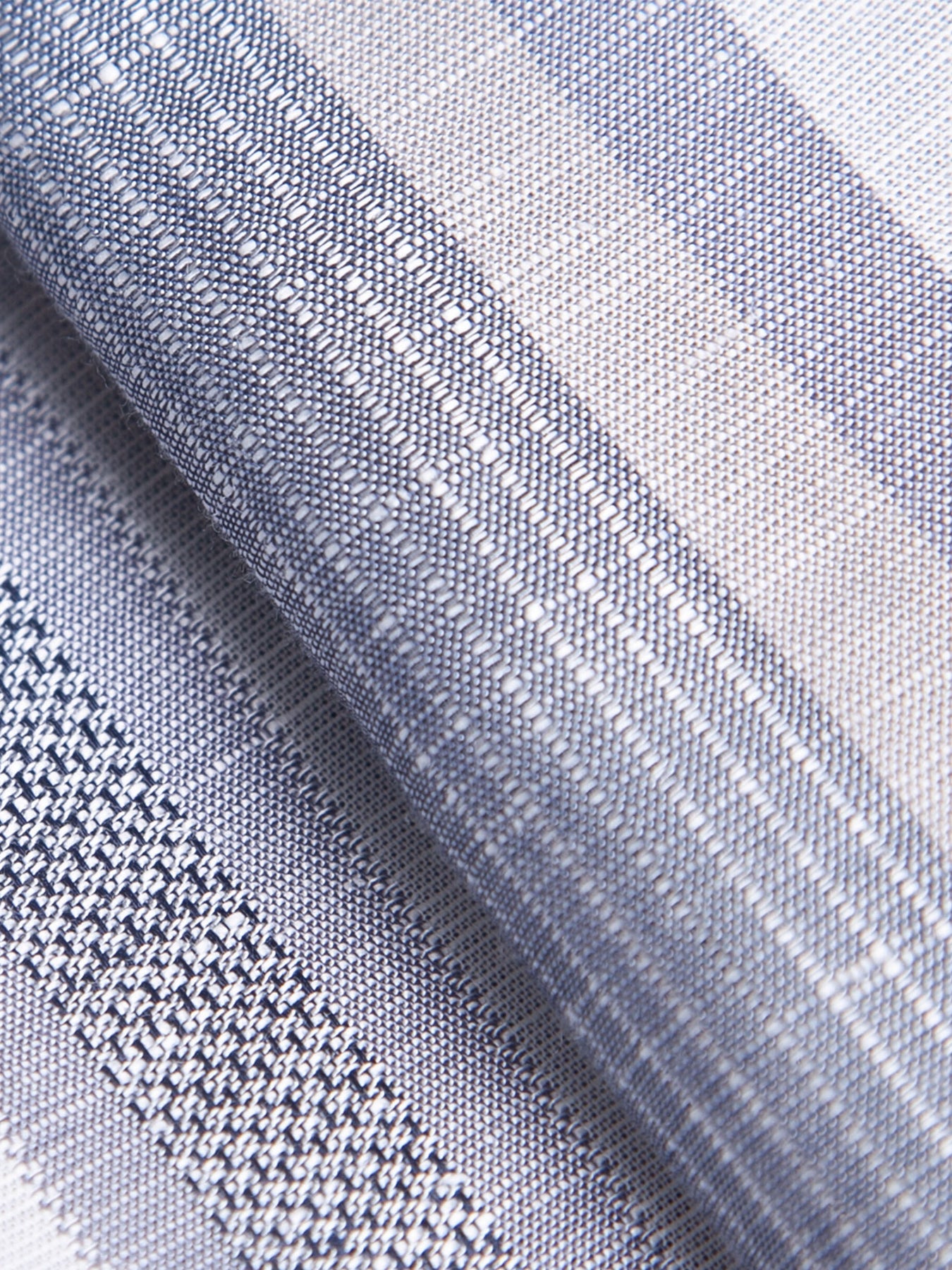 This fabric blends Lyocell and linen, balancing the silky softness and fluidity of Lyocell with the crisp, breathable qualities of linen. Naturally moisture-wicking and breathable, it ensures all-day comfort. The hand-dyed pinstripes in deep blue and white create a refined texture that reflects light beautifully. With Lyocell derived from renewable wood sources and linen grown as a low-impact crop, this fabric is not only luxurious to wear but also crafted in harmony with the environment.