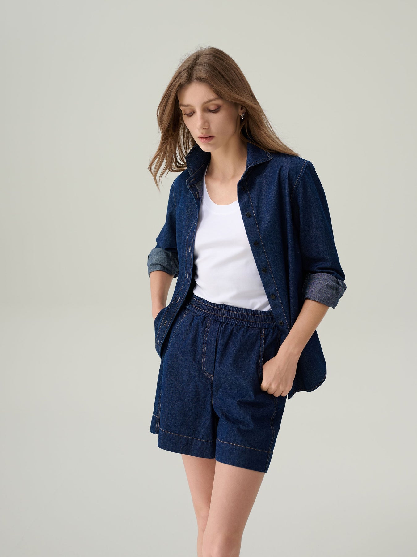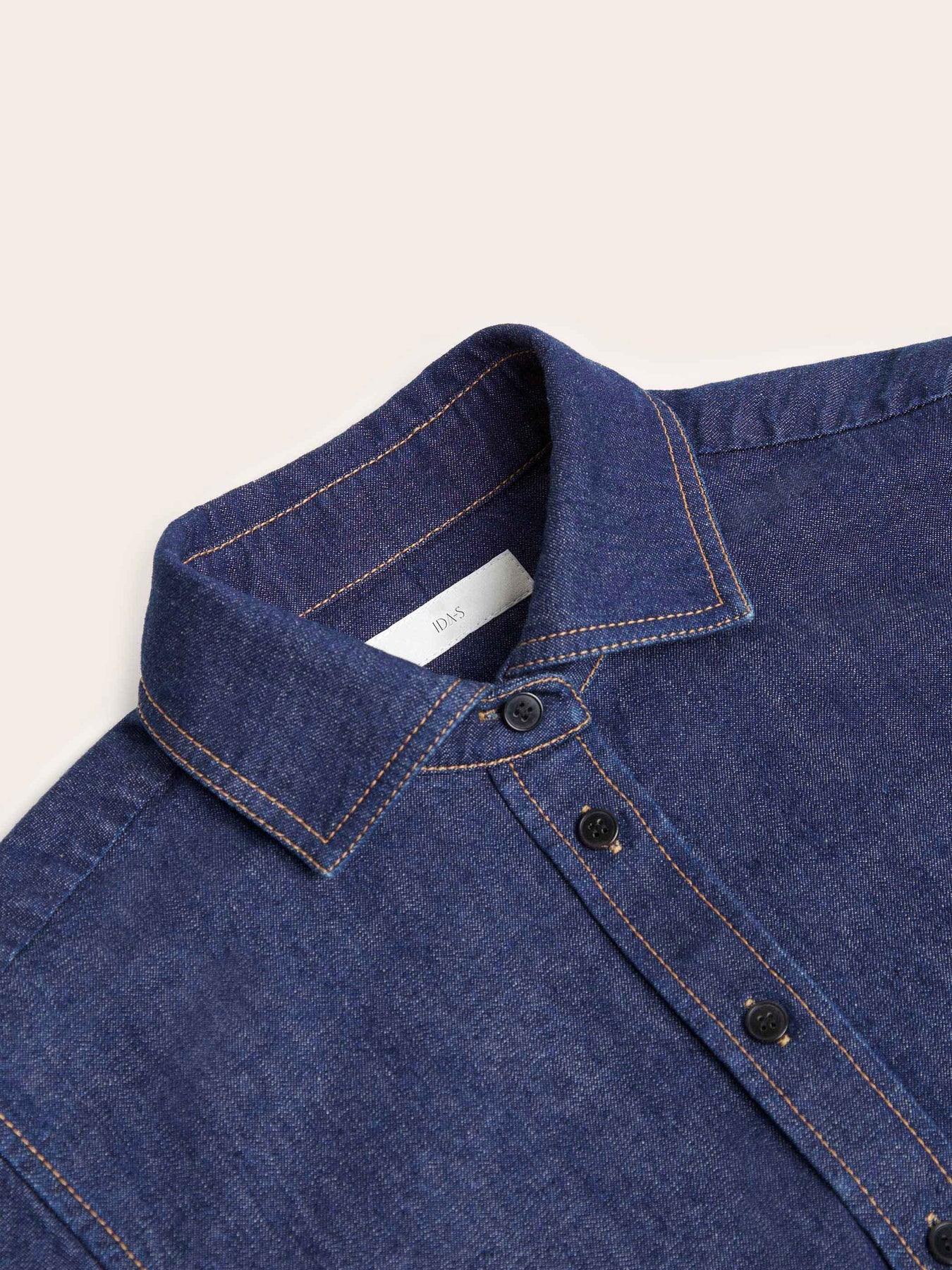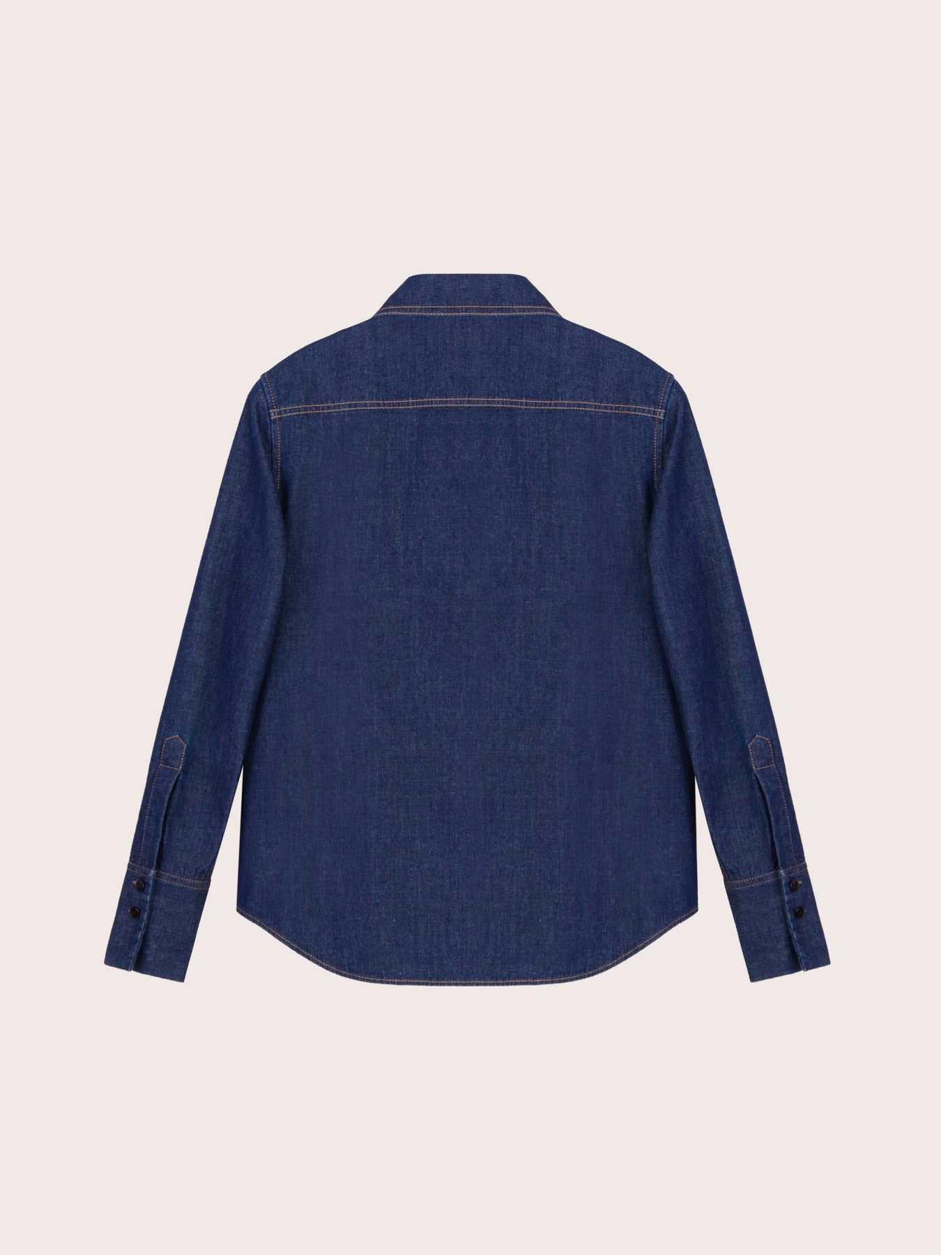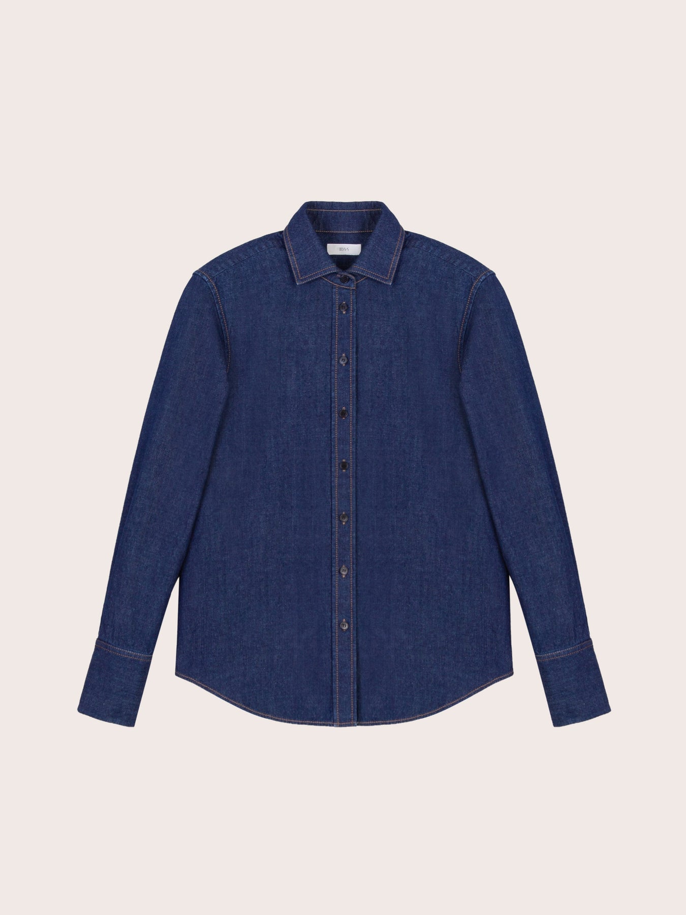 The Daphne Dark Denim Button Down Top is cut from soft, midweight indigo denim with a smooth, structured drape. Designed with a pointed collar, long sleeves with buttoned cuffs, and a curved hemline, it offers timeless versatility. Contrast topstitching adds a subtle highlight, while the clean back yoke enhances its tailored appeal. Wear it buttoned up for a polished look or open over a tee for effortless layering.