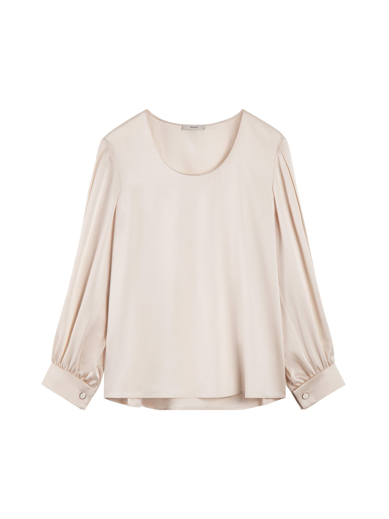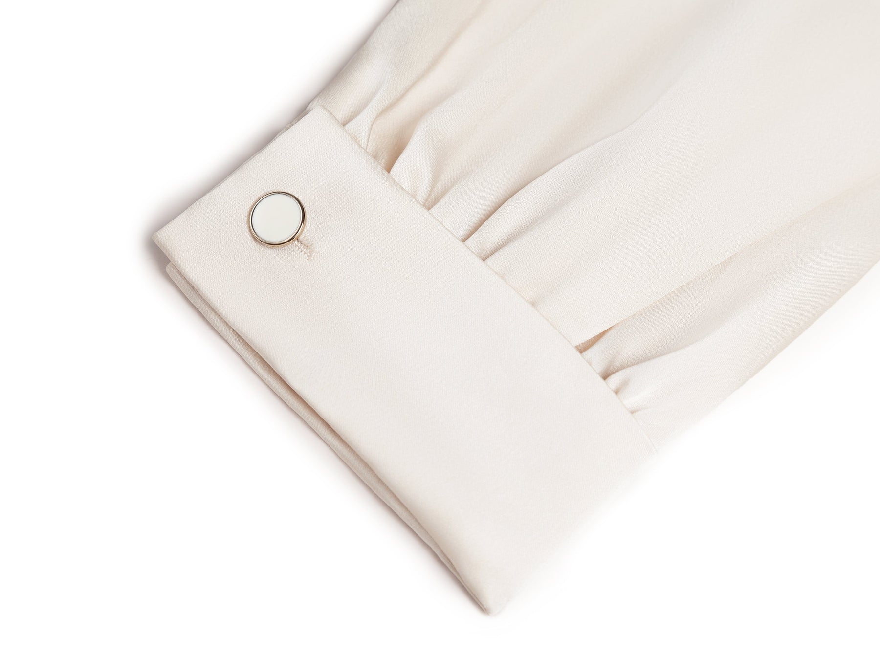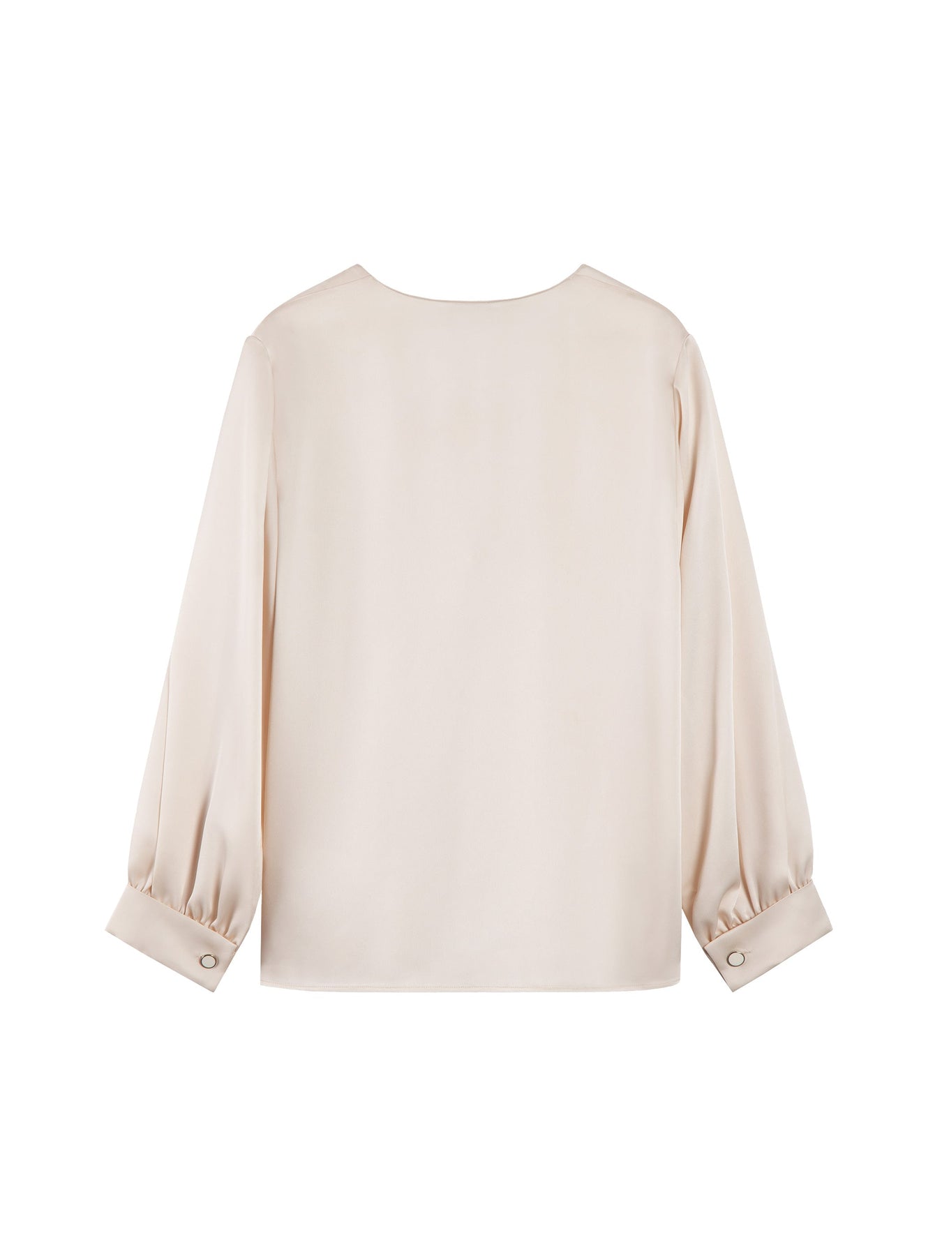 Add this soft, silky Long Sleeve Open Neck Blouse to your workwear wardrobe. Featuring a flattering open neckline that accentuates your collarbone, this blouse offers a relaxed silhouette with long, billowy sleeves finished with French cuffs, adding a touch of refined elegance. Wear it solo for a sophisticated look, or layer it under your favorite blazer or sweater.