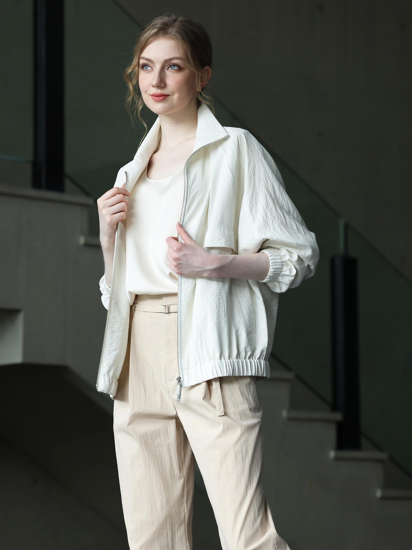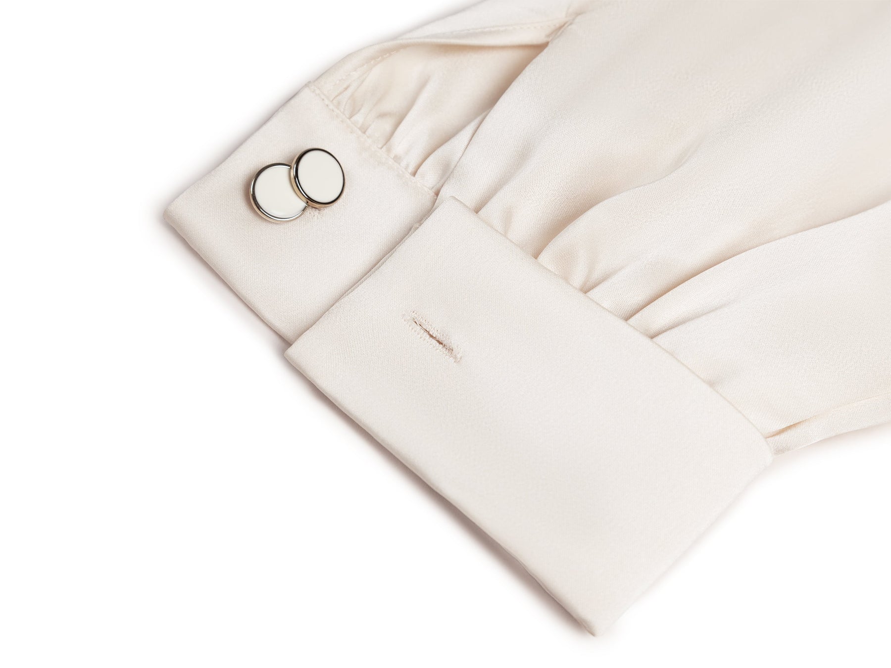 This blouse is made from high-density acetate and polyester fibers, creating a silk-like texture with a dense, smooth feel. These qualities contribute to its moisture-wicking properties, keeping you dry and comfortable all day. Soft to the touch, the fabric has an elegant luster and a beautiful drape, adding a touch of sophistication.