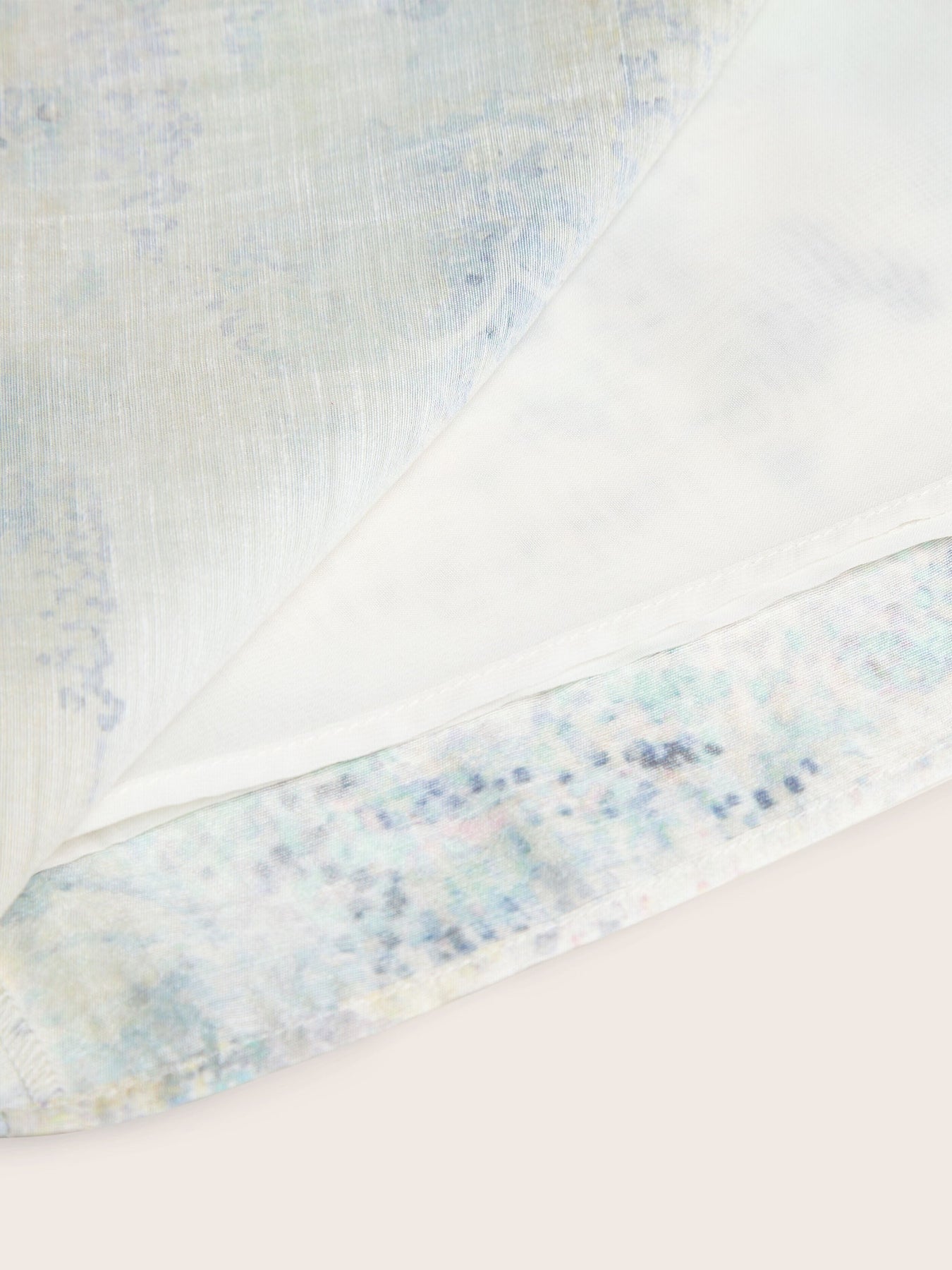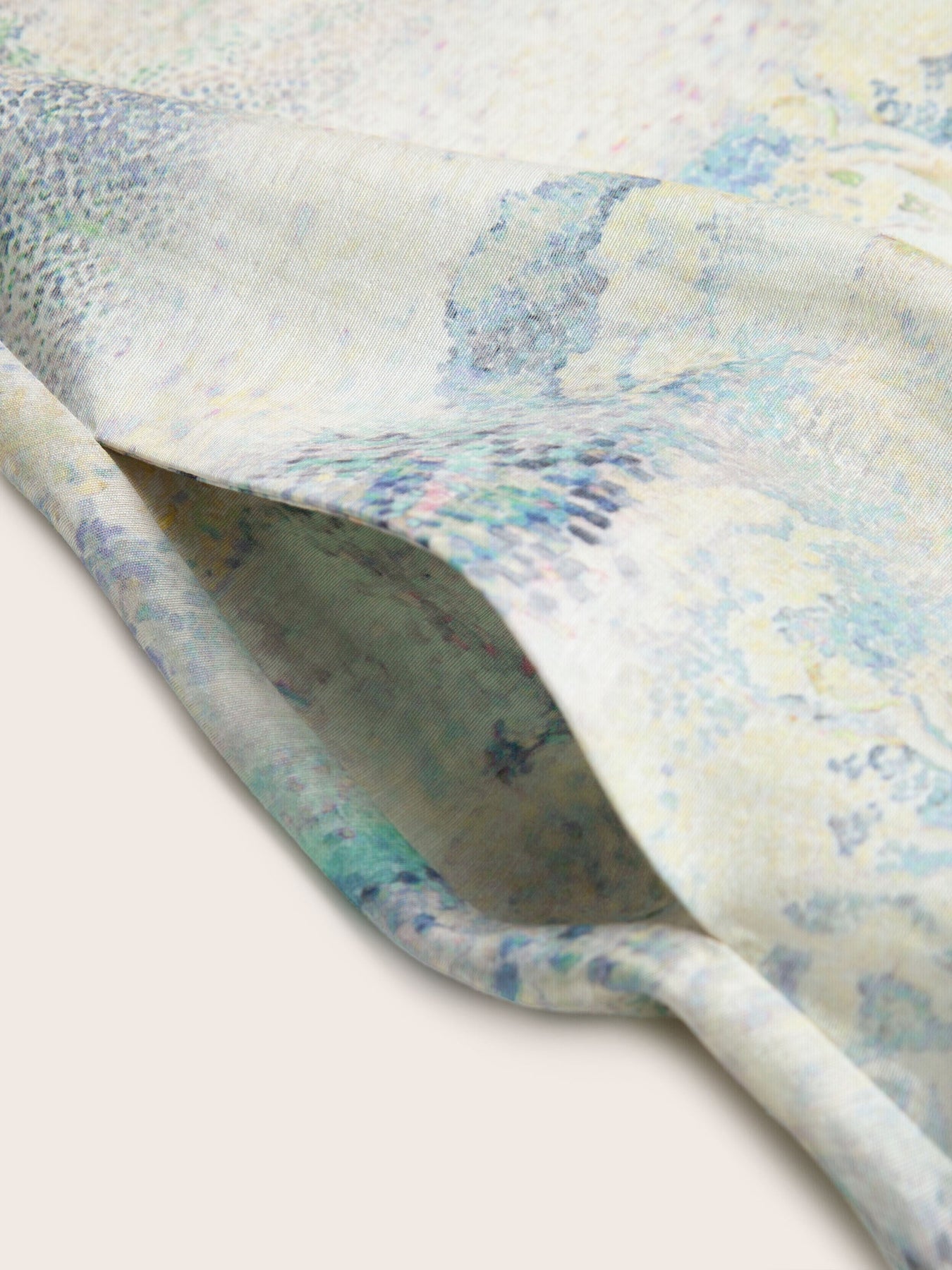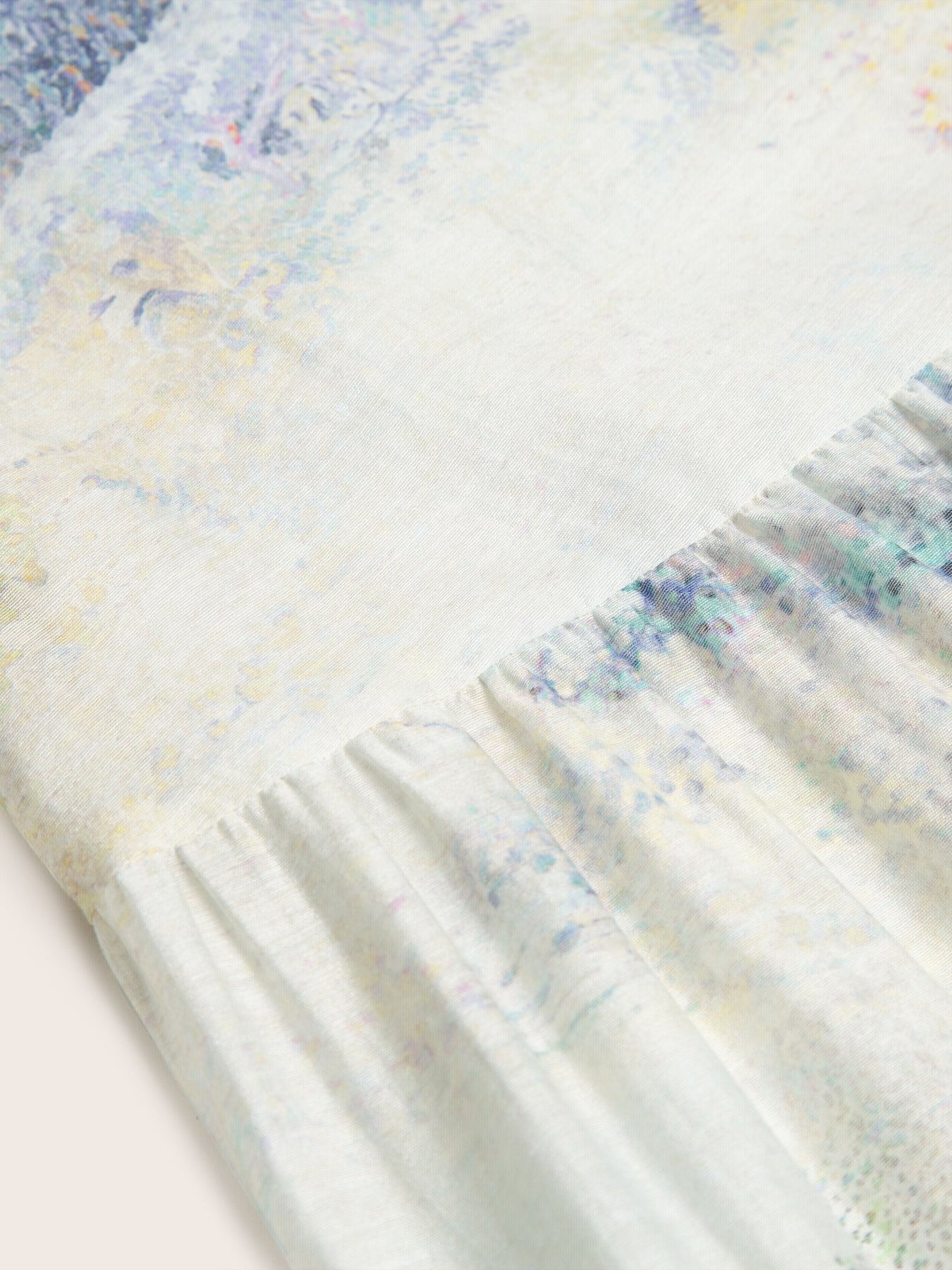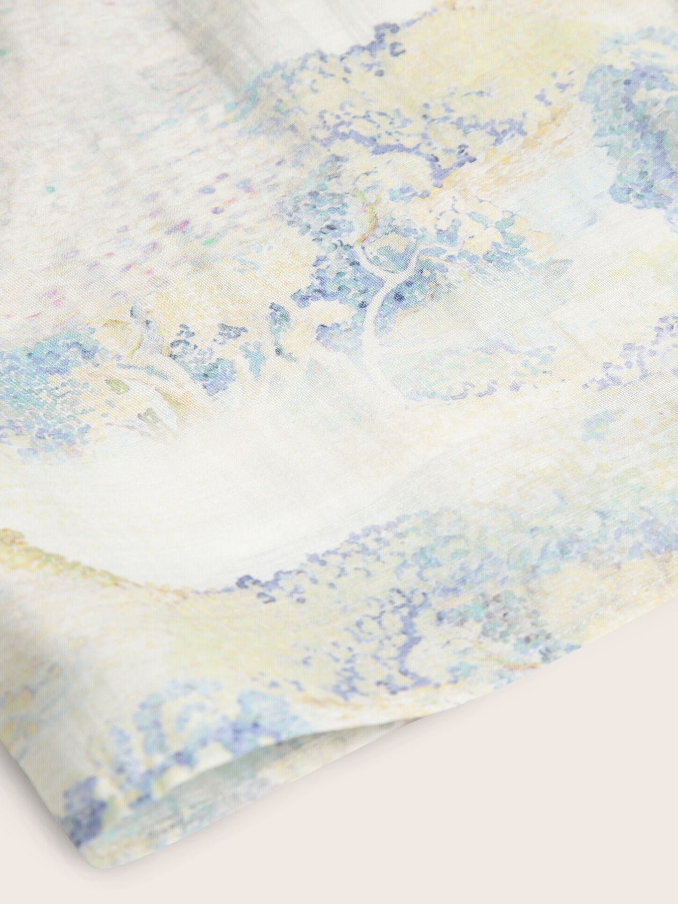 The fabric is a distinctive blend of lyocell, polyester, acetate, and linen. Lyocell, made from sustainably sourced eucalyptus, lends softness and breathability, while polyester adds durability. Acetate enhances the fabric with a subtle lustre, and linen introduces natural texture. Finished with high-precision digital printing, the fabric transforms into a wearable work of art.