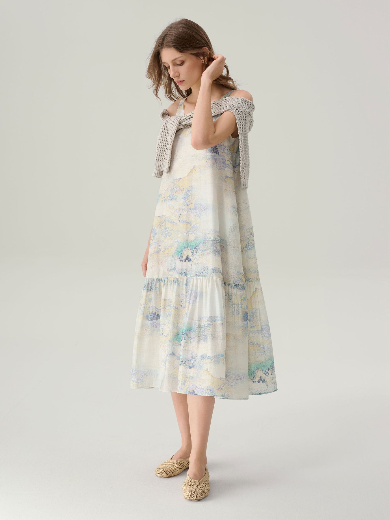 Crafted in a fluid silhouette, the Mia Midi Dress features a delicate V-neckline and slender straps that fall into a relaxed, tiered skirt. The dreamy ink-inspired print blends muted pastel tones with watercolour-like strokes, evoking a serene, painterly landscape. Designed to drape beautifully while ensuring all-day comfort, this dress is an effortless choice for warm days, casual gatherings, or holiday escapes.