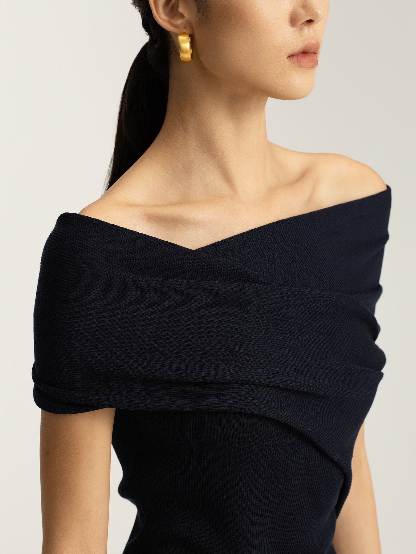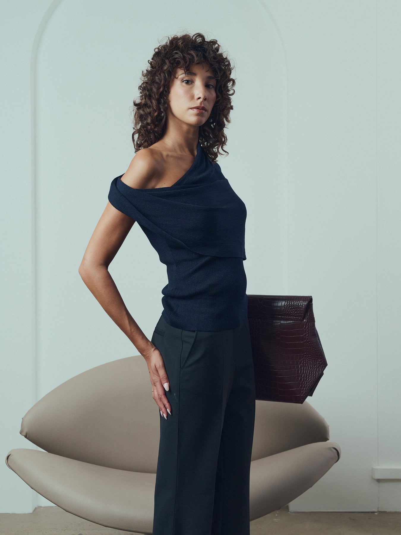 The Romy Silk Off The Shoulder Top features a softly draped silhouette designed to contour and flatter. Crafted in a lightweight Lyocell blend, it’s shaped with a wide asymmetric neckline that wraps gently across the shoulders, creating a graceful fold-over effect. The snug fit flatters a wide variety of body shapes, while the fine knit texture adds both softness and structure. Designed to transition seamlessly from day to evening, it pairs effortlessly with tailored trousers or fluid skirts for an ultra-feminine look.