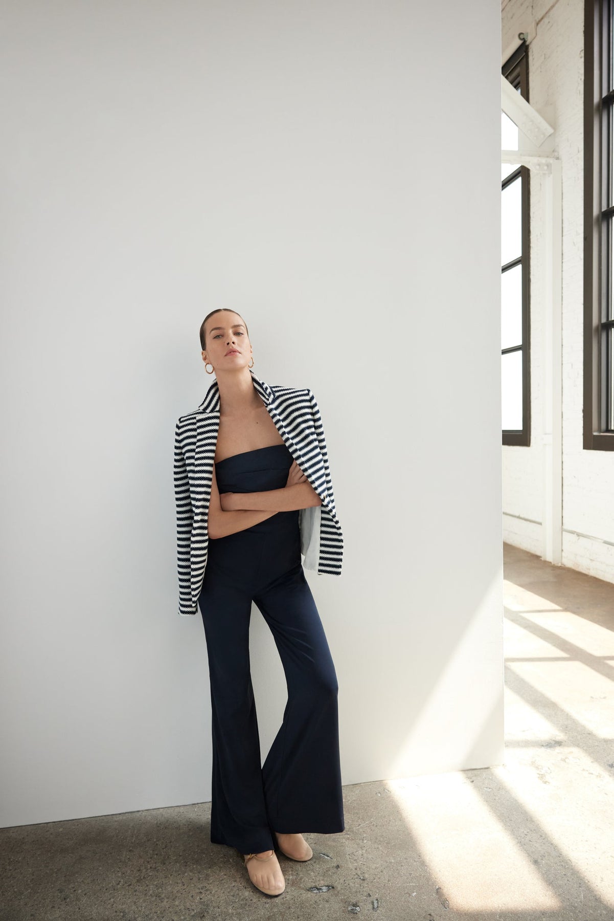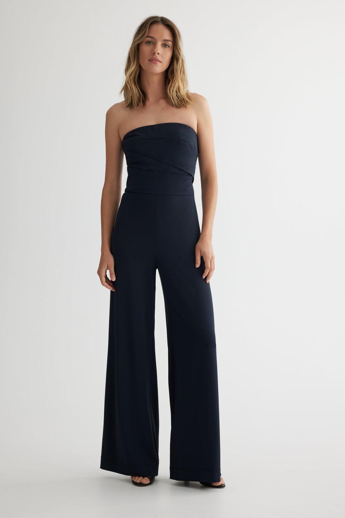 This bustier jumpsuit is made from our classic matte jersey fabric. The elegant draped bustier and wide legs will have you falling in love. Add a jacket to cover your arms for a perfect work ourfit.