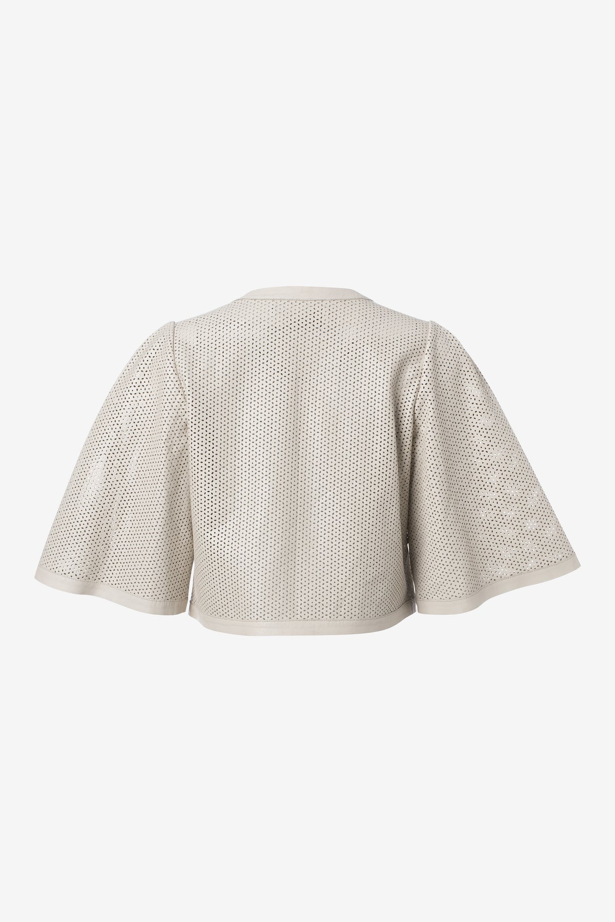 Short leather jacket with perforated pattern. The effect of the wide sleeves will add dimension to your look.