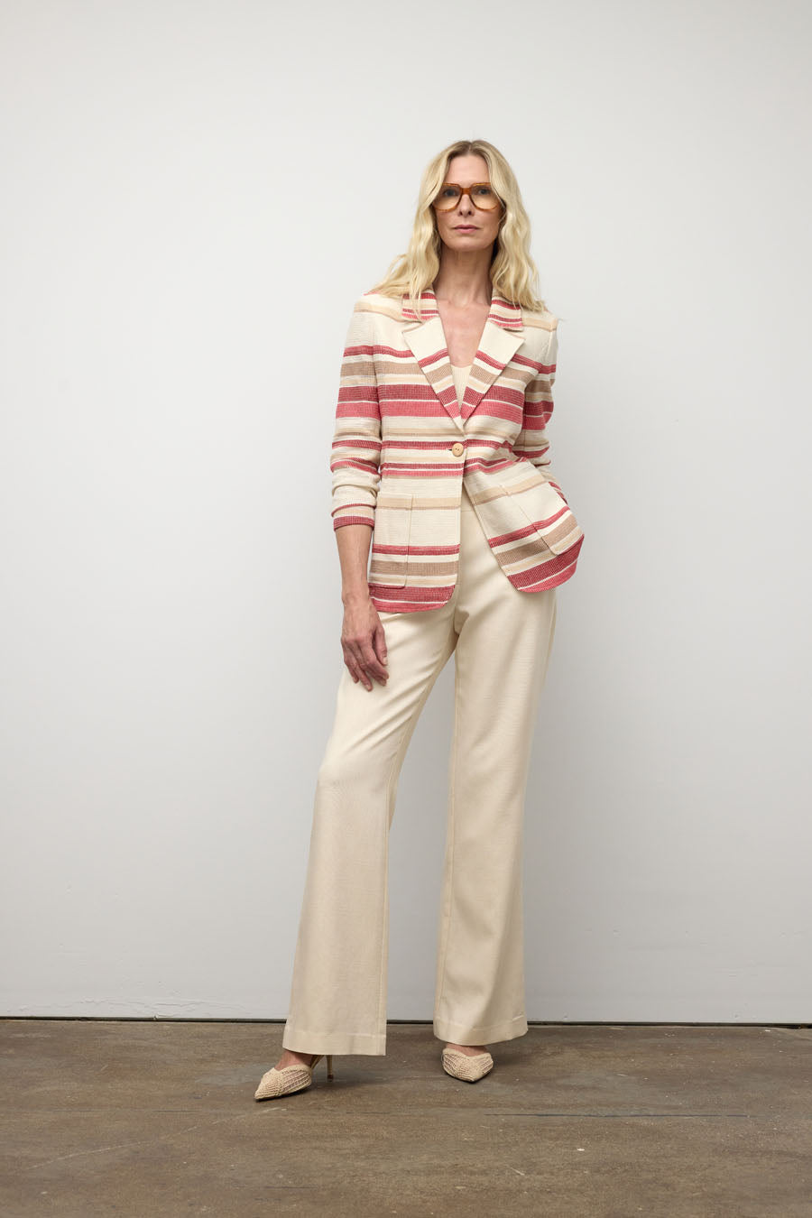 Striped blazer in shades of blue with two hip pockets. Can be worn open or closed with the unique button .