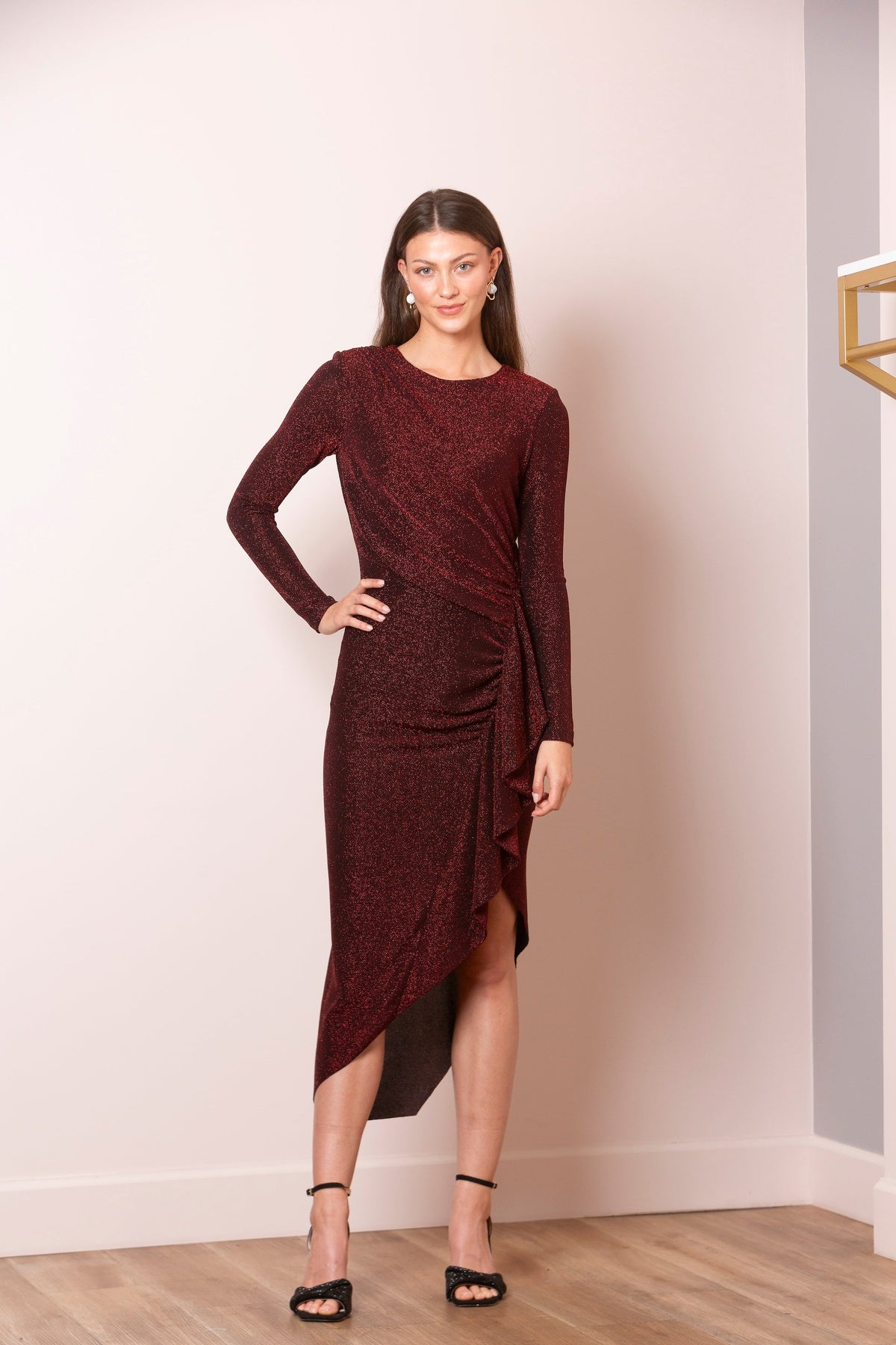Elsie Lurex Asymmetrical Hem Dress.