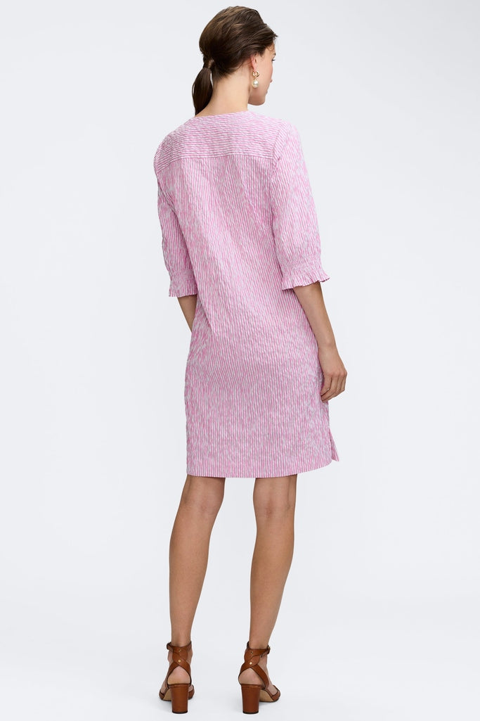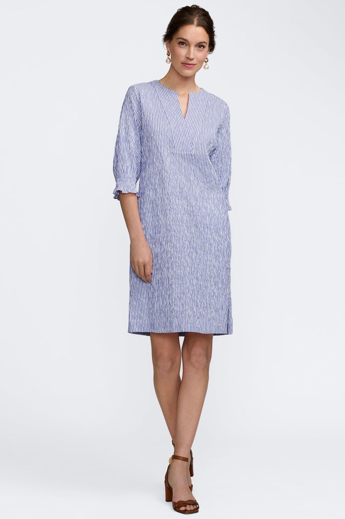 Alicia is effortless style at its best. Made from textured crinkle jacquard with just the right amount of stretch, this easy silhouette moves with you while maintaining a refined look. A bold V-neckline adds modern shape, while a subtle kissing pleat at the back creates soft drape and dimension. Smocked three-quarter sleeves finish with gentle volume, and side slits offer freedom of movement throughout the day. Thoughtfully designed with pockets (always), Alicia is the kind of dress you slip on once and wear everywhere.