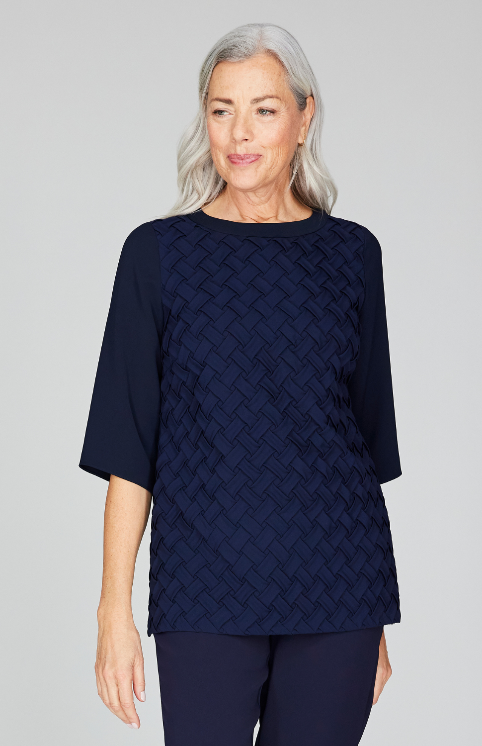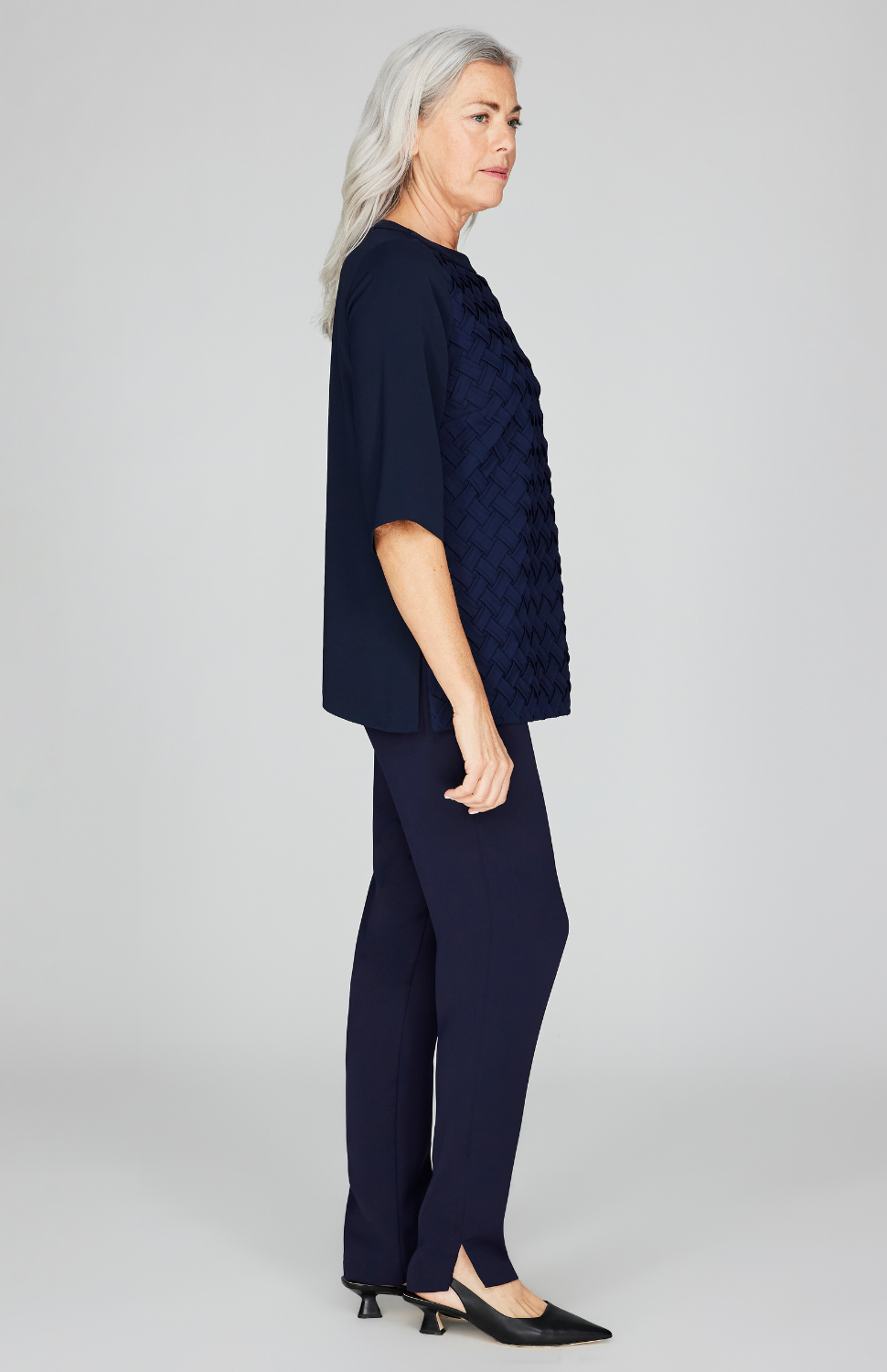 A classic pullover style blouse cut in our signature Black Lustrous Crepe in combination with an elevated smocking texture. The blouse features ¾ sleeves and a back neckline keyhole.