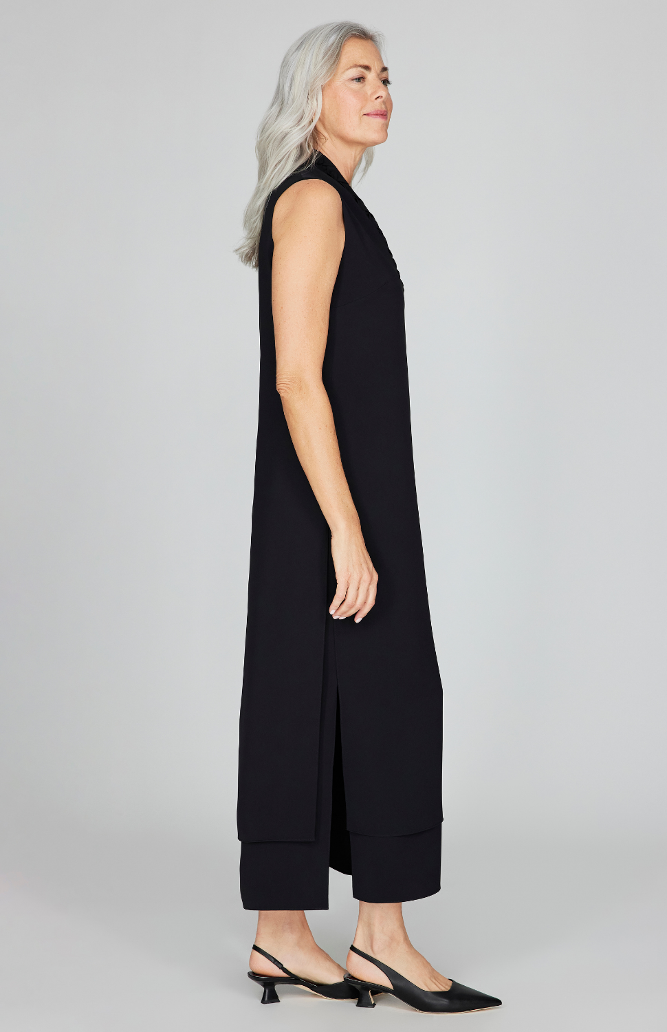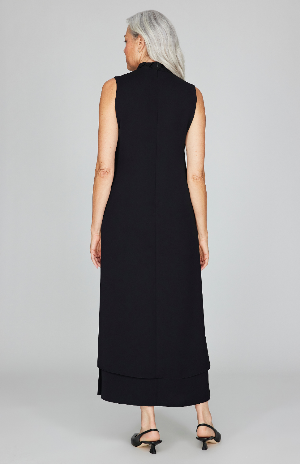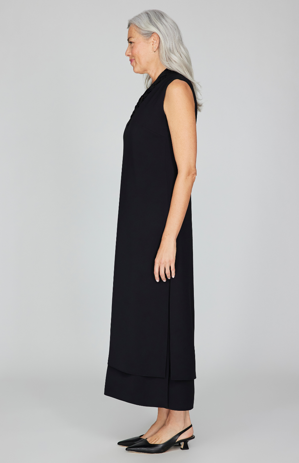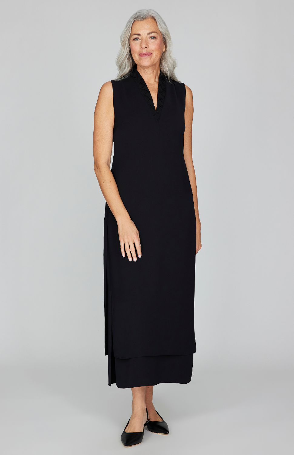 An elegant midi length dress with our signature double layer detailing. This dress features a flattering high V neck and side slits that offer movement. It is finished with a back zipper.