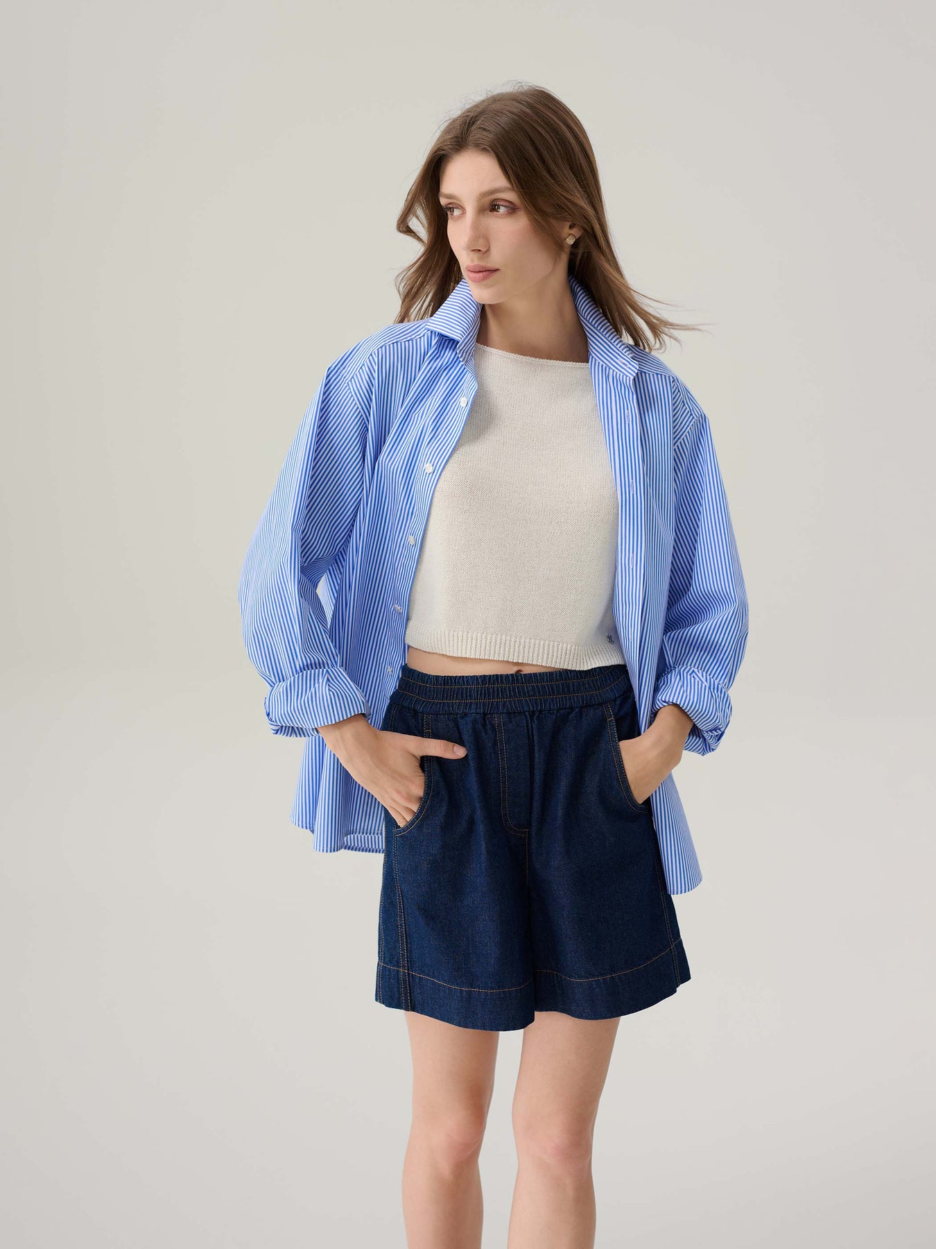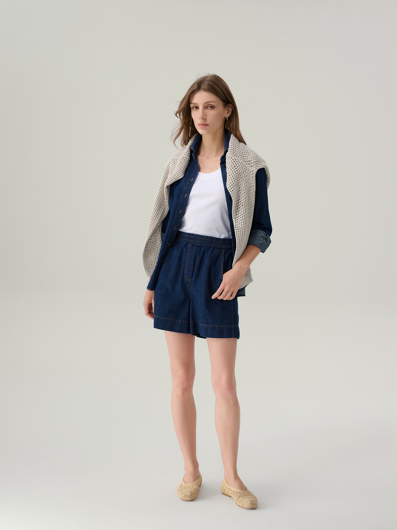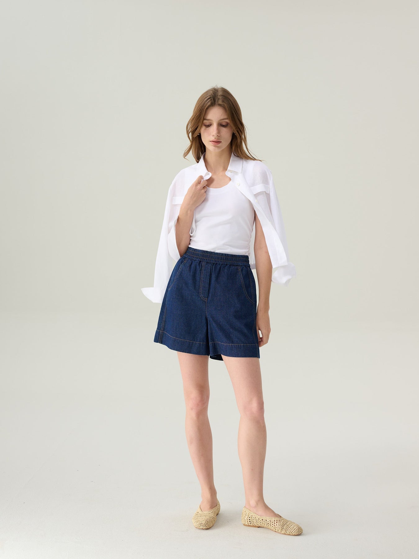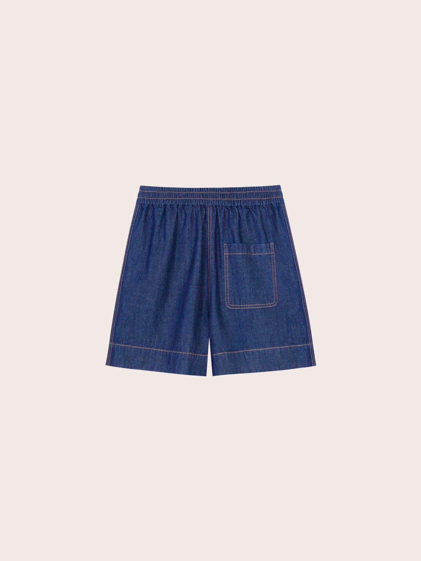 The Ruby Cotton Shorts offer a relaxed take on denim, crafted from lightweight indigo cotton with contrast topstitching for a classic finish. An elasticized waistband ensures all-day comfort, while front slash pockets and a single back patch pocket add casual functionality. The wide leg cut allows easy movement—ideal for warm-weather wear.