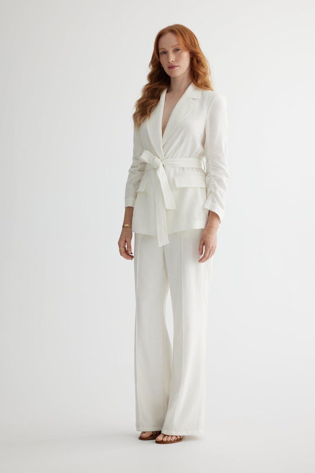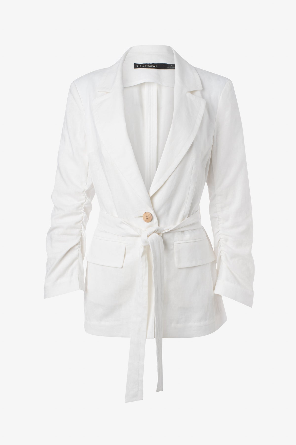 Belted jacket in OEKO-TEX STANDARD 100*-certified linen blend. This slim-fit jacket with 3/4 pleated sleeves can be worn with or without the belt.