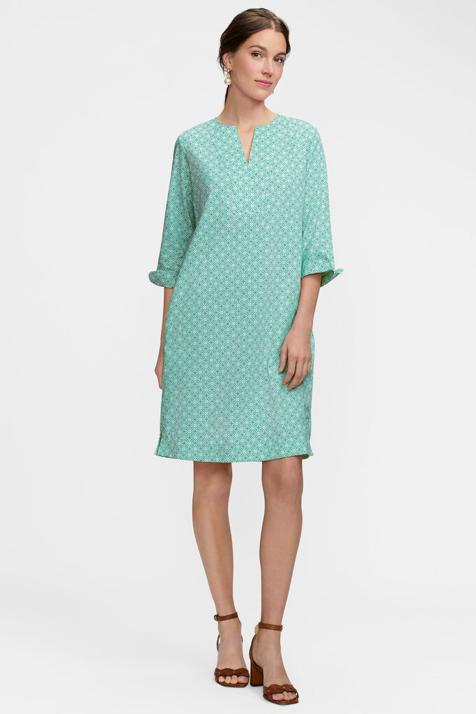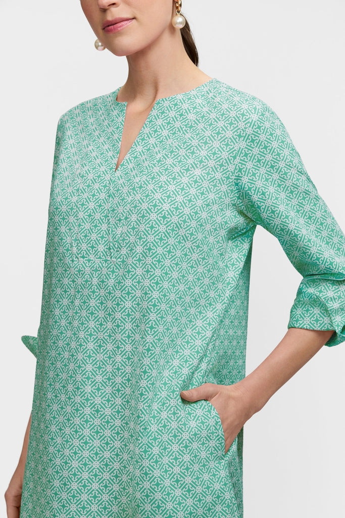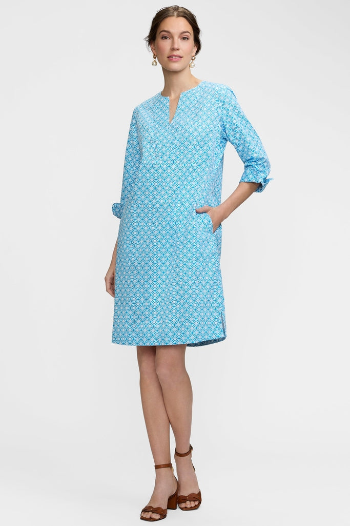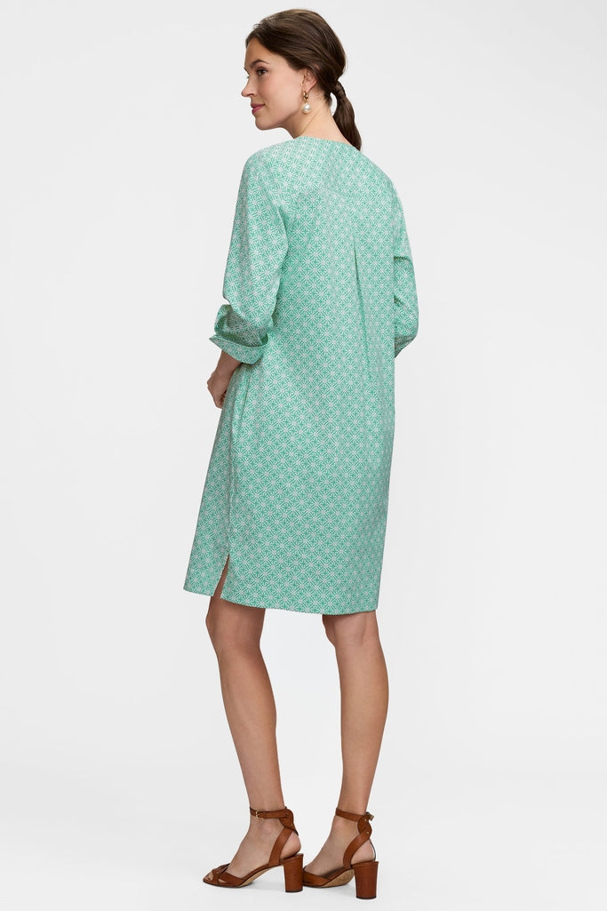 Refined yet easy to wear, Vena brings a modern sensibility to an artful dress silhouette. Crafted in smooth cotton sateen with a soft sheen, the graphic geo lattice print adds subtle dimension and visual interest without overpowering the look. A clean V-neckline flatters effortlessly, while pockets keep it practical. It’s the kind of piece that feels thoughtfully styled from the moment you slip it on—polished enough for day, relaxed enough for everywhere else.