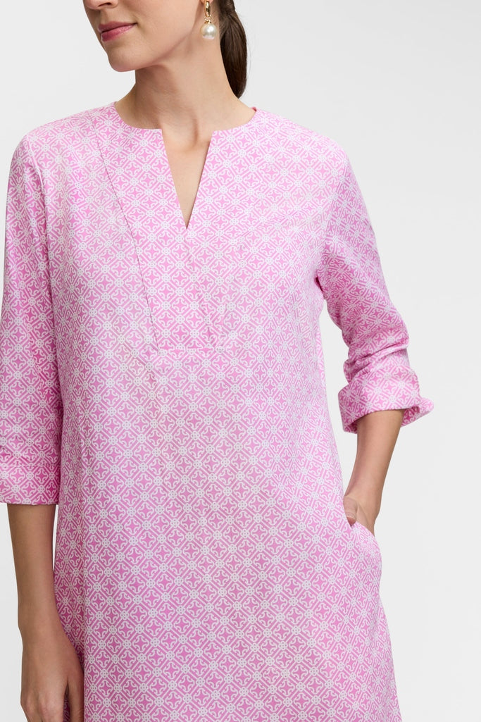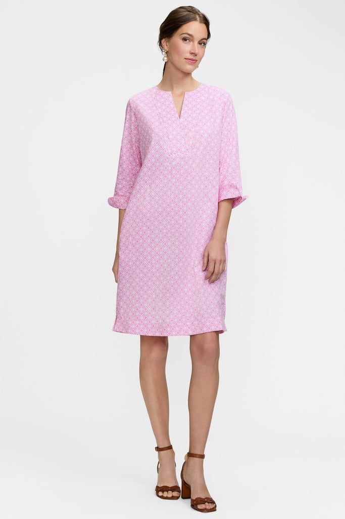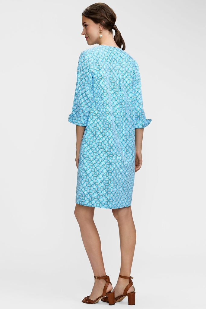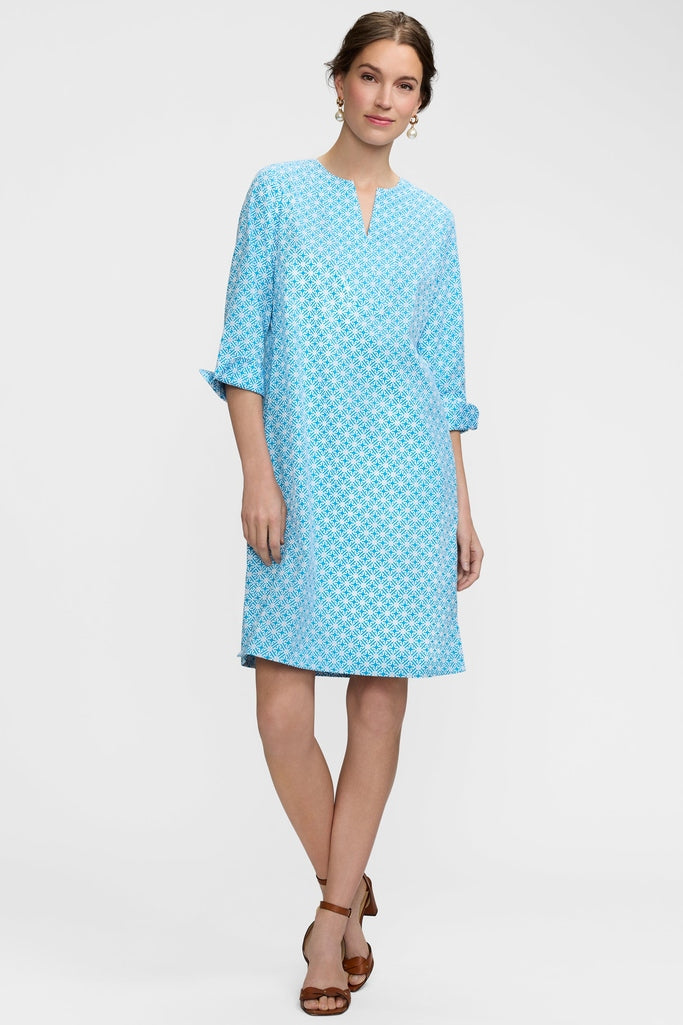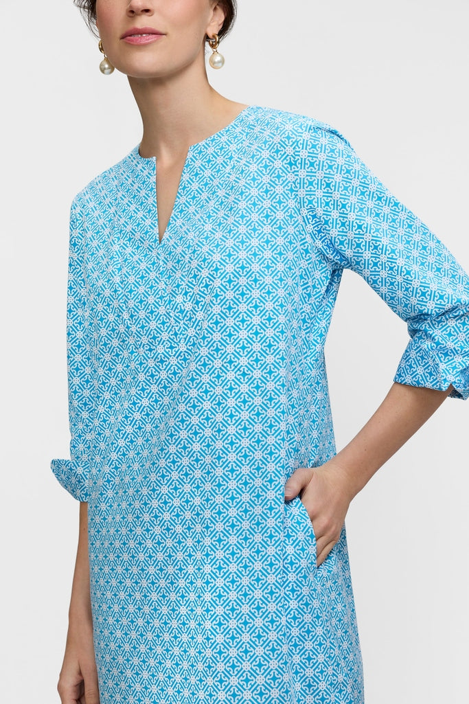 Refined yet easy to wear, Vena brings a modern sensibility to an artful dress silhouette. Crafted in smooth cotton sateen with a soft sheen, the graphic geo lattice print adds subtle dimension and visual interest without overpowering the look. A clean V-neckline flatters effortlessly, while pockets keep it practical. It’s the kind of piece that feels thoughtfully styled from the moment you slip it on—polished enough for day, relaxed enough for everywhere else.